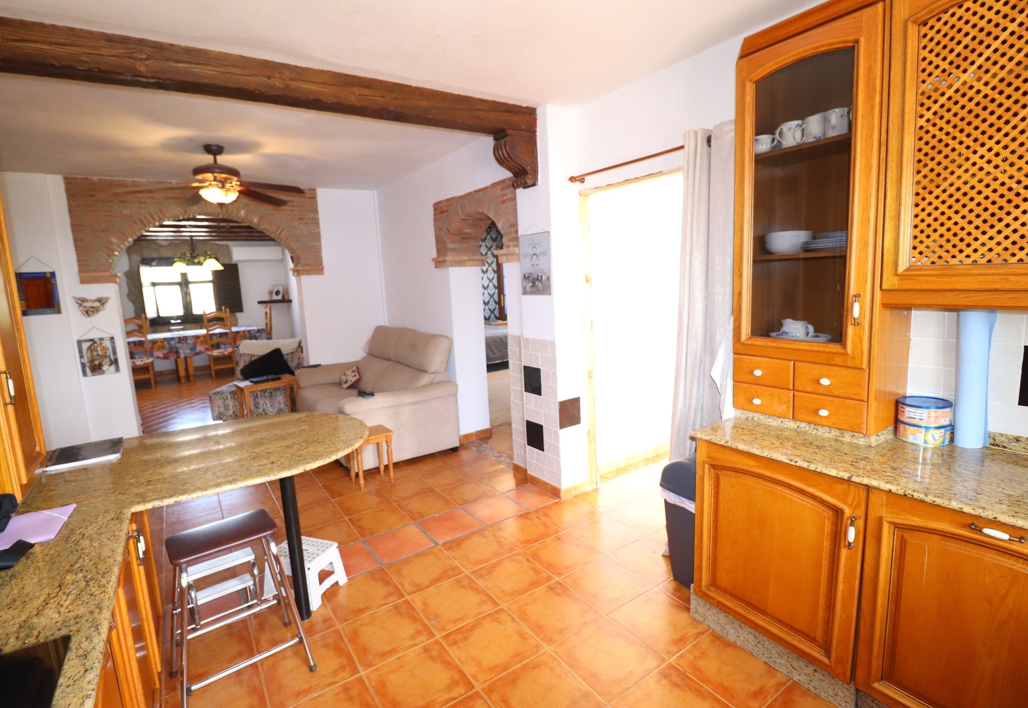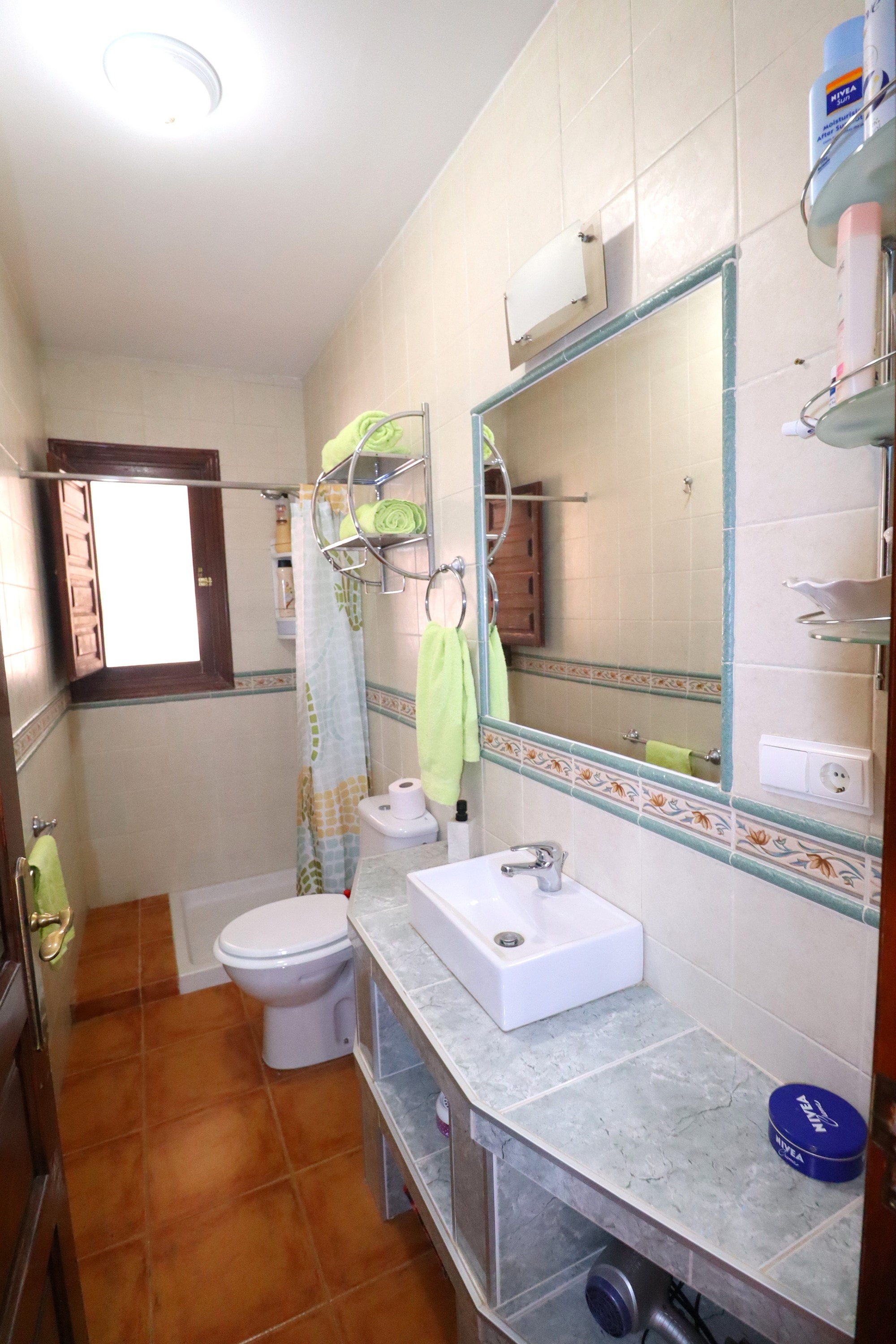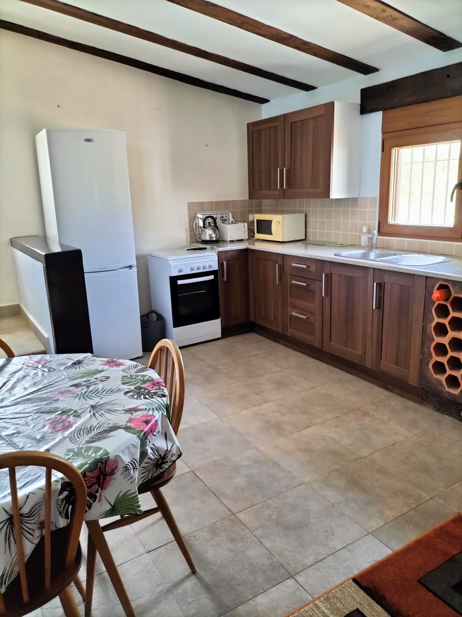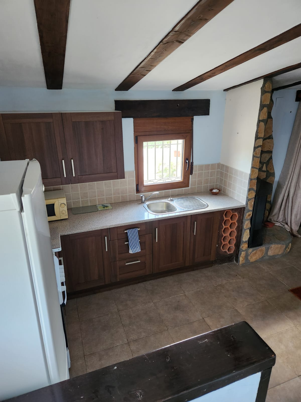 The casita/self-contained apartment is at the side of the property and next to the terraced courtyard. To the front of the casita there is a fully fenced private garden/terrace area. Front door open to a fully fitted open plan kitchen with built-in corner wood burning stove, dining area and a large bedroom with air-conditioning unit; a walk in shower and a washbasin within the bedroom. From the kitchen a few steps up lead to the toilet with a washbasin and WC.