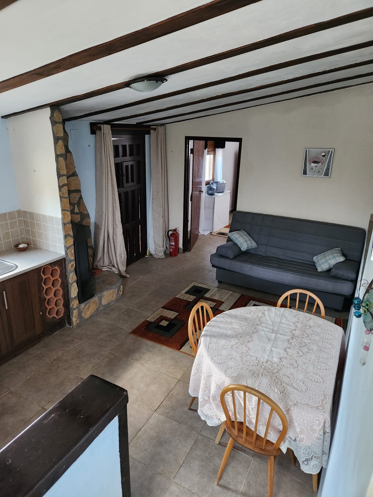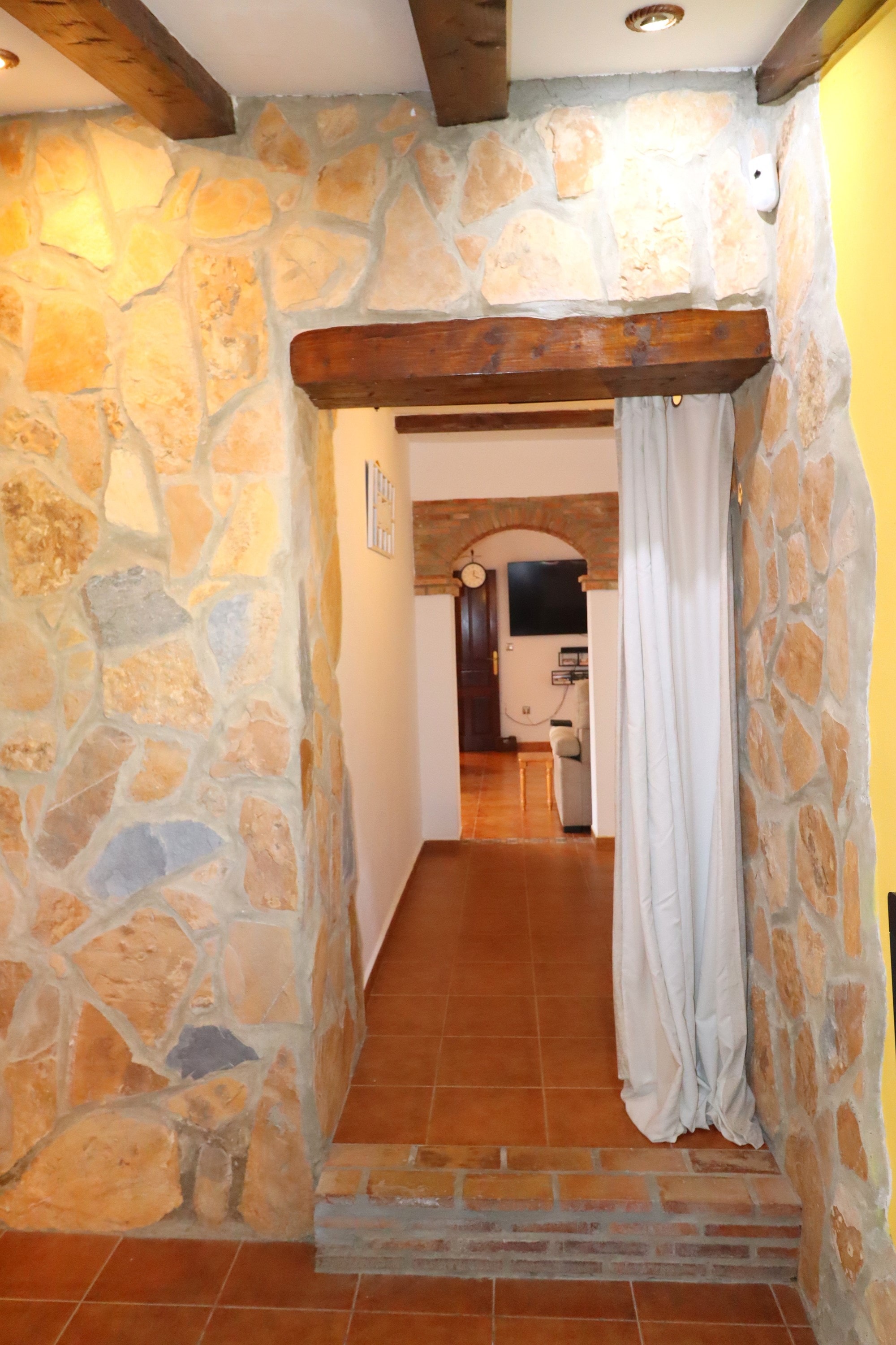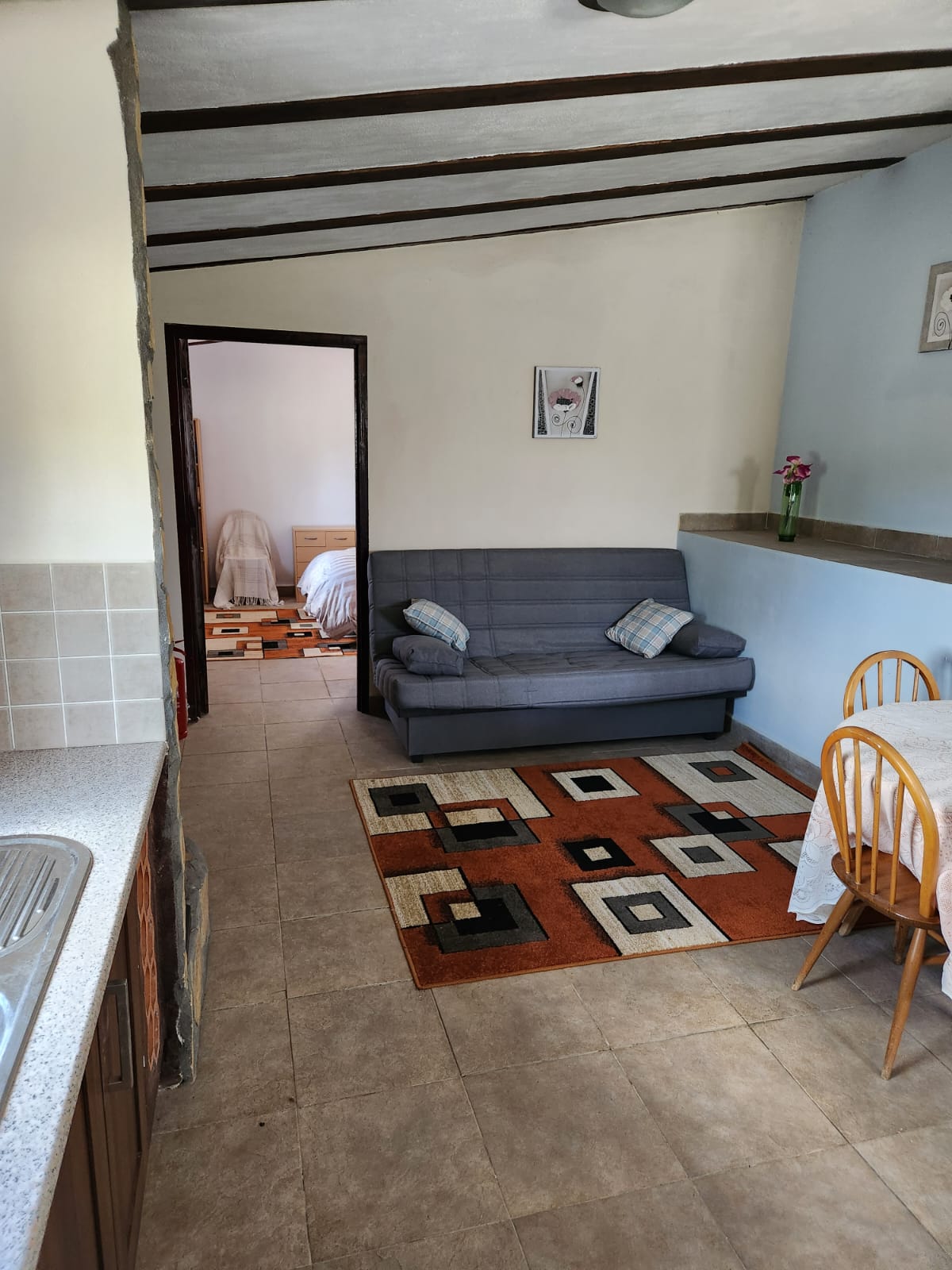 The casita/self-contained apartment is at the side of the property and next to the terraced courtyard. To the front of the casita there is a fully fenced private garden/terrace area. Front door open to a fully fitted open plan kitchen with built-in corner wood burning stove, dining area and a large bedroom with air-conditioning unit; a walk in shower and a washbasin within the bedroom. From the kitchen a few steps up lead to the toilet with a washbasin and WC.