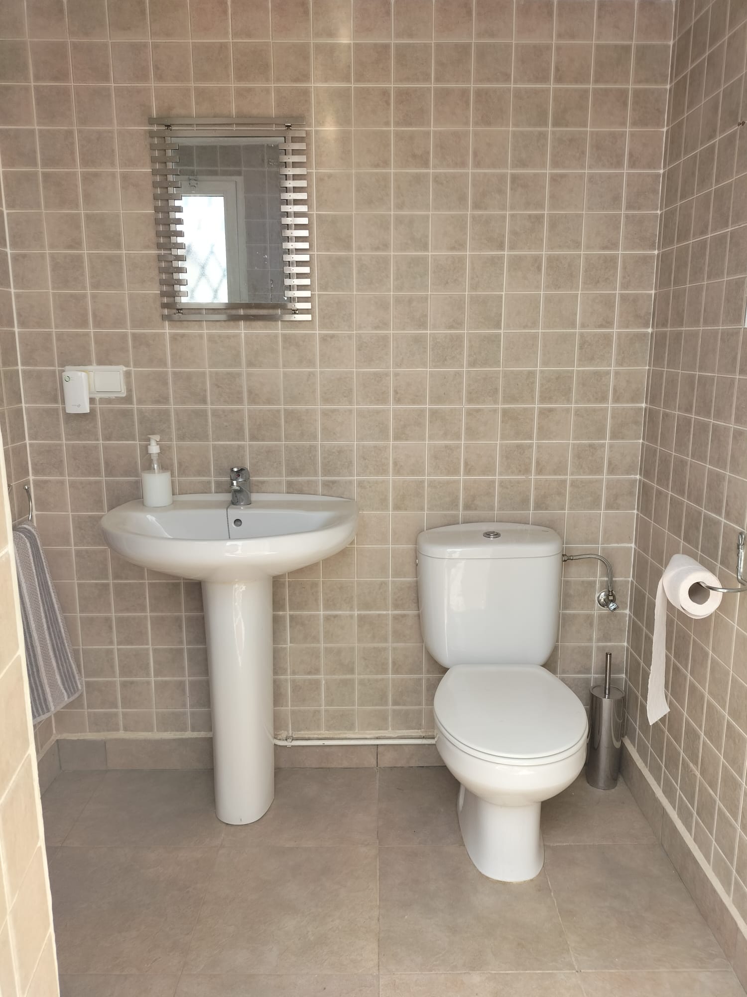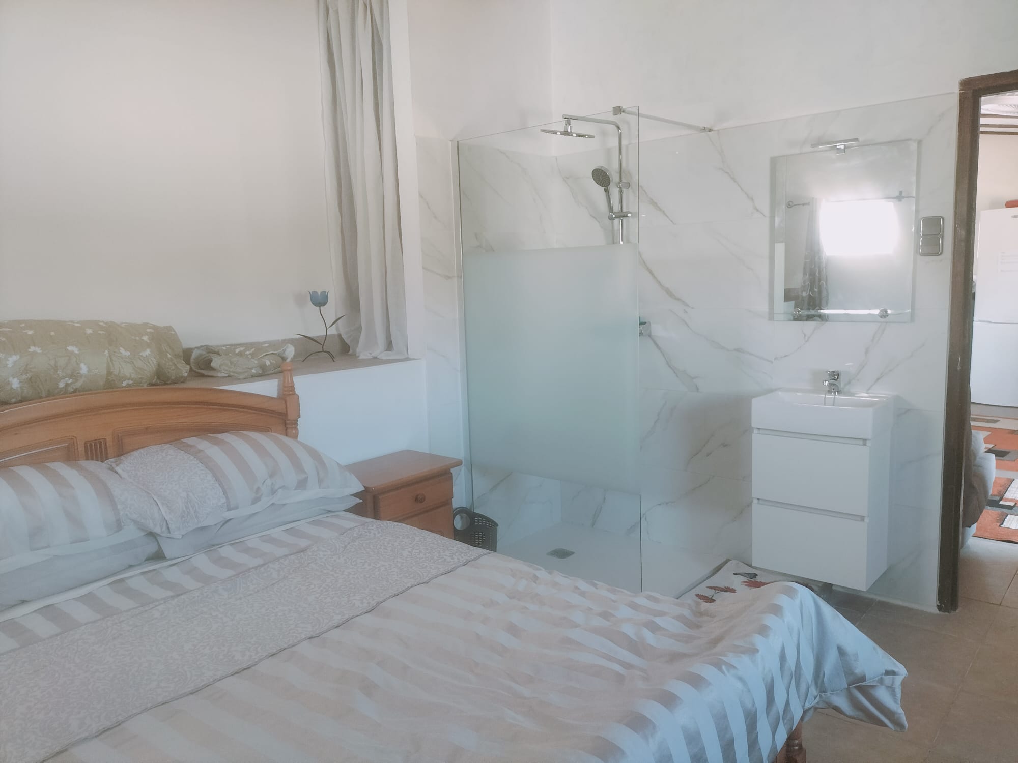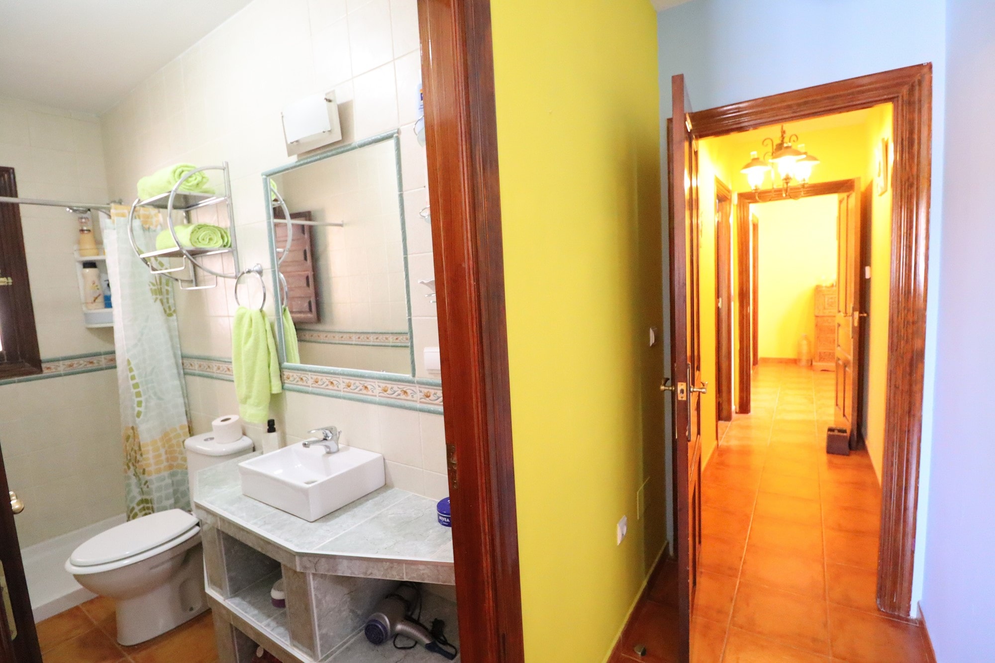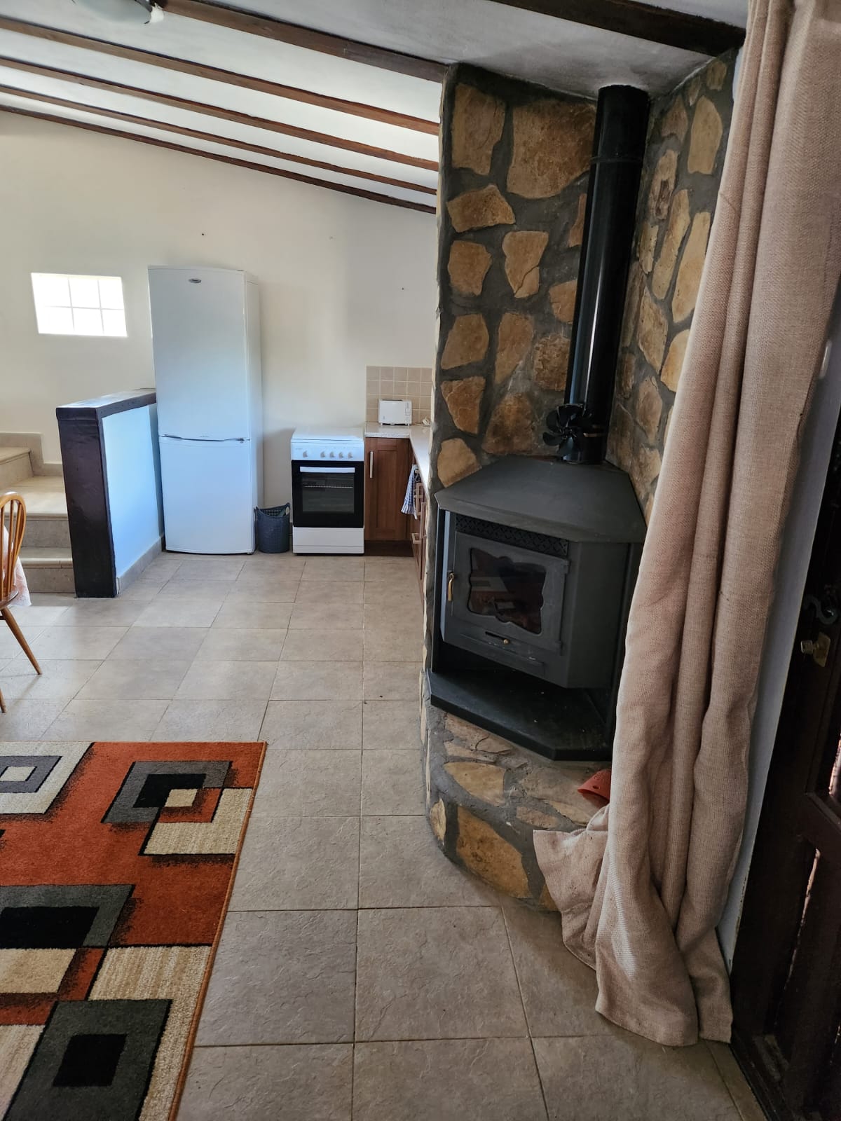 The casita/self-contained apartment is at the side of the property and next to the terraced courtyard. To the front of the casita there is a fully fenced private garden/terrace area. Front door open to a fully fitted open plan kitchen with built-in corner wood burning stove, dining area and a large bedroom with air-conditioning unit; a walk in shower and a washbasin within the bedroom. From the kitchen a few steps up lead to the toilet with a washbasin and WC.