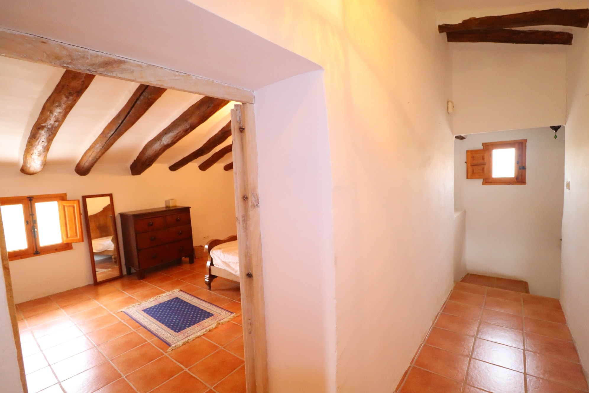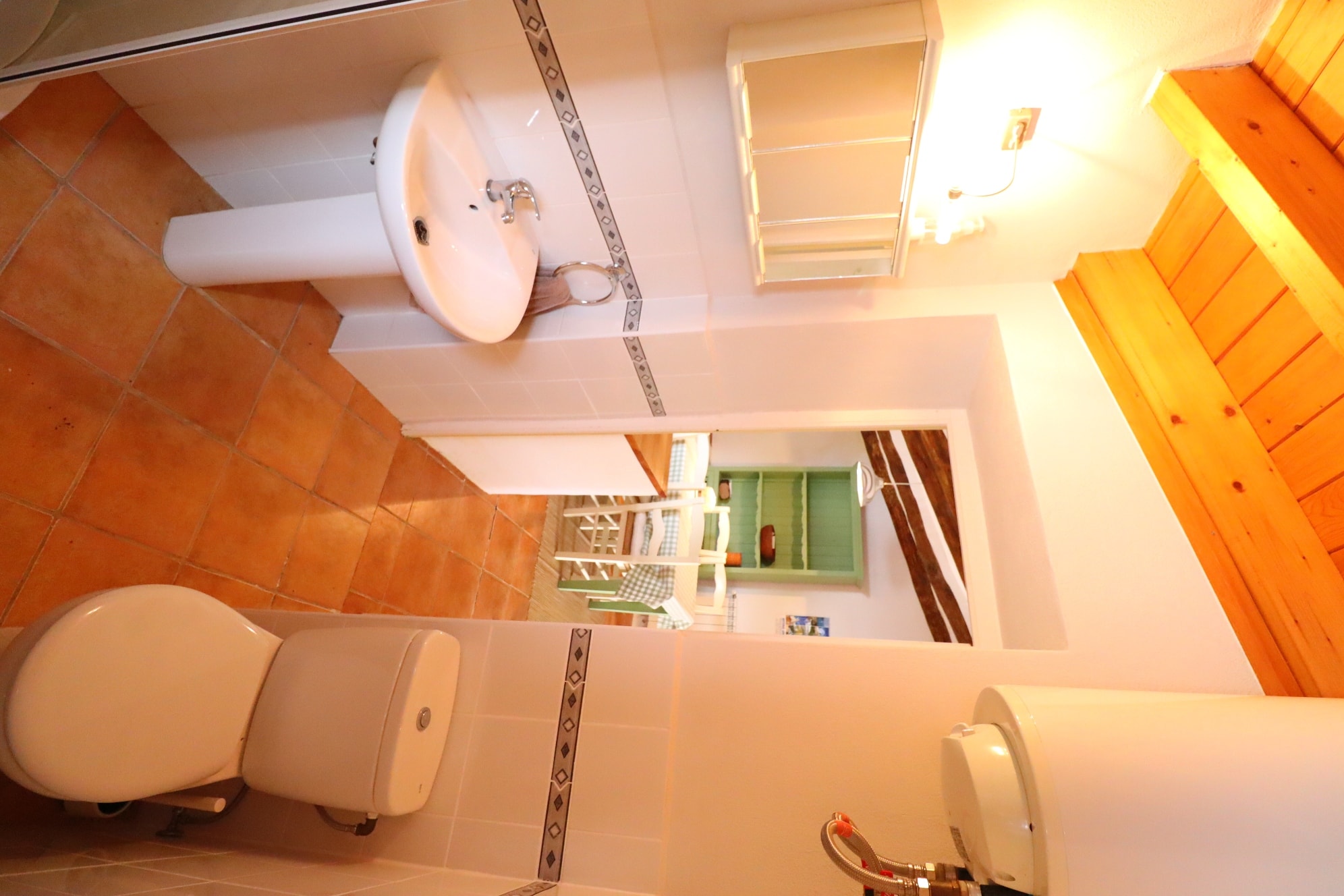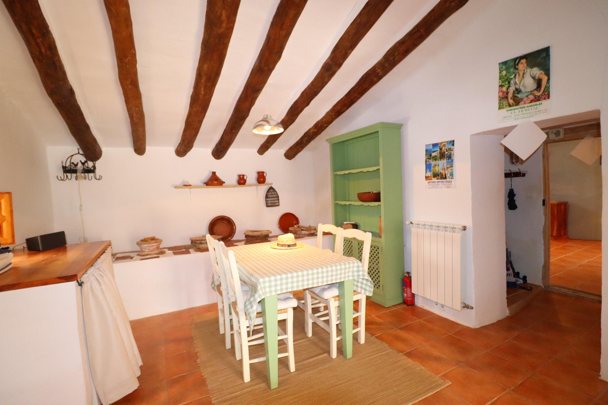 Front door leading into the beautiful Andalucian country style kitchen with adjacent breakfast room. The kitchen is fitted with granite worktops, gas range cooker, fridge-freezer, dishwasher, microwave. A step up from the kitchen is the kitchen table area /breakfast room with 5 old tinajas/anforas embedded into the raised work surface. Off the breakfast area is a shower room. Also from the breakfast area, a short hallway leads to the dining room with staircase up to the upper floor. A door from the dining room opens into the spacious and cosy lounge with antique wooden floor, open fireplace and inset wood burning stove. There is a door from the lounge which leads into the lobby/hall with double main doors out to the frontage of the property. Another door opposite the hall door leading into bedroom one, double. At the end of the lounge a door, after a couple of steps up, leads to a bright and spacious summer/entertainment room with bar area and wood burning stove. Near the bar area is a small room with the boiler for the gas central heating system. Double patio doors from the summer room open to a private enclosed patio (the hot tub seen in the pictures is not included). This walled courtyard is also accessed from the the front and rear of the home. This beautiful patio resembles a typical Andalucian patio with decorative tiles in the wall, wall plates, raised flower pots, a water feature and a tiled bench seating around the hot tub. A door from the patio leads into a good size store room.