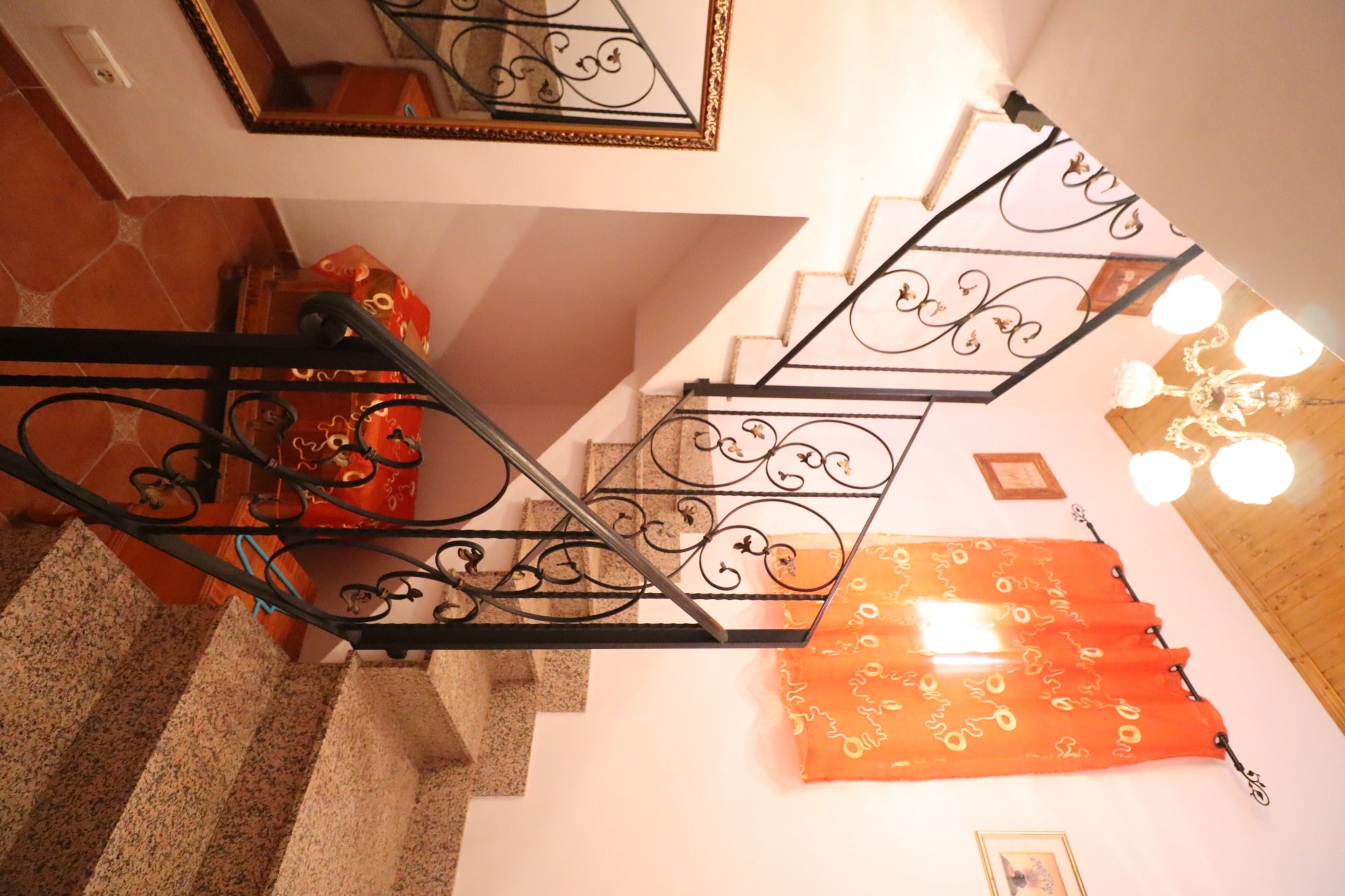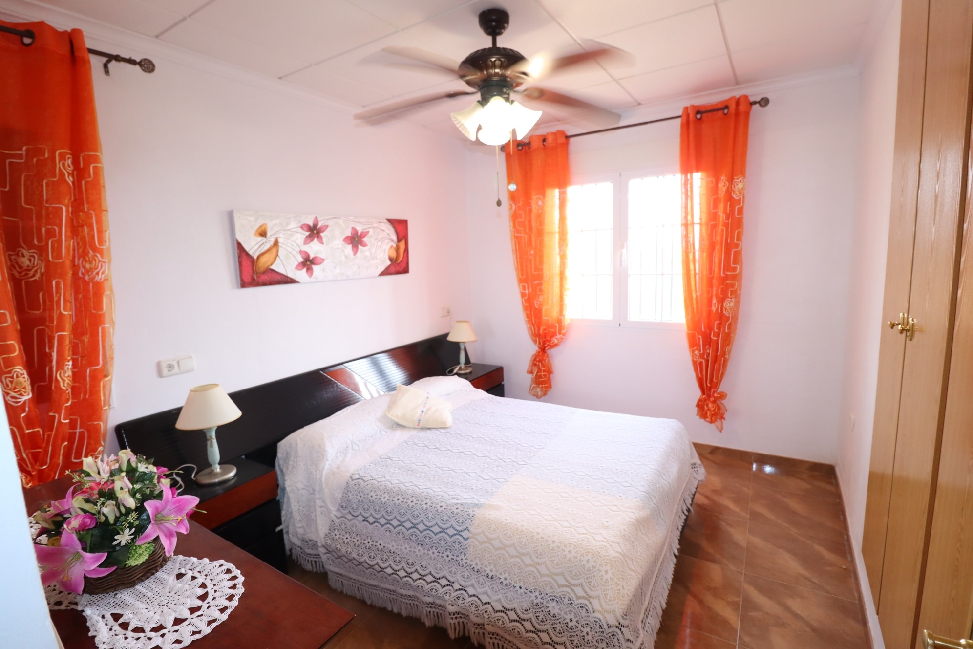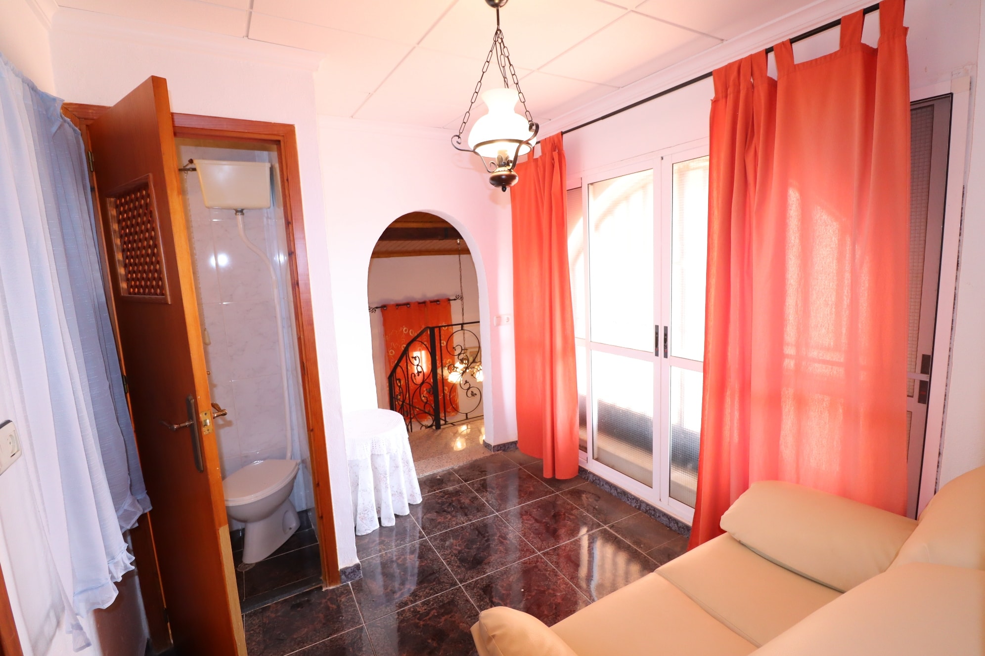 A staircase from the hallway leads up to the attic floor. As you reach the landing area, to the left a hallway leads to the largest bedroom which comes with fitted wardrobes. Returning to the landing, to the front an archway leads to a small living area. Off the living is a toilet with washbasin and WC. A short hallway from the living area leads to the rest of the sleeping accommodation area, which comprises of 2 double bedrooms and one single. From the living area are double patio doors out to a large terrace with amazing views across the valley towards the surrounding mountains and the city of Lorca with its illuminated hilltop medieval castle. From this terrace outdoor stairs down to the front terrace.