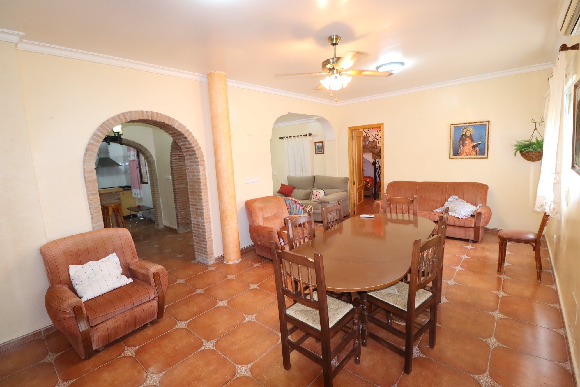 The house comprises: Spacious entrance/hall, airy and bright lounge with air conditioning unit, and fitted kitchen which may require updating/modernization. Off the lounge, a door opens to a short hallway which leads to the right to a store room, and adjacent shower room.