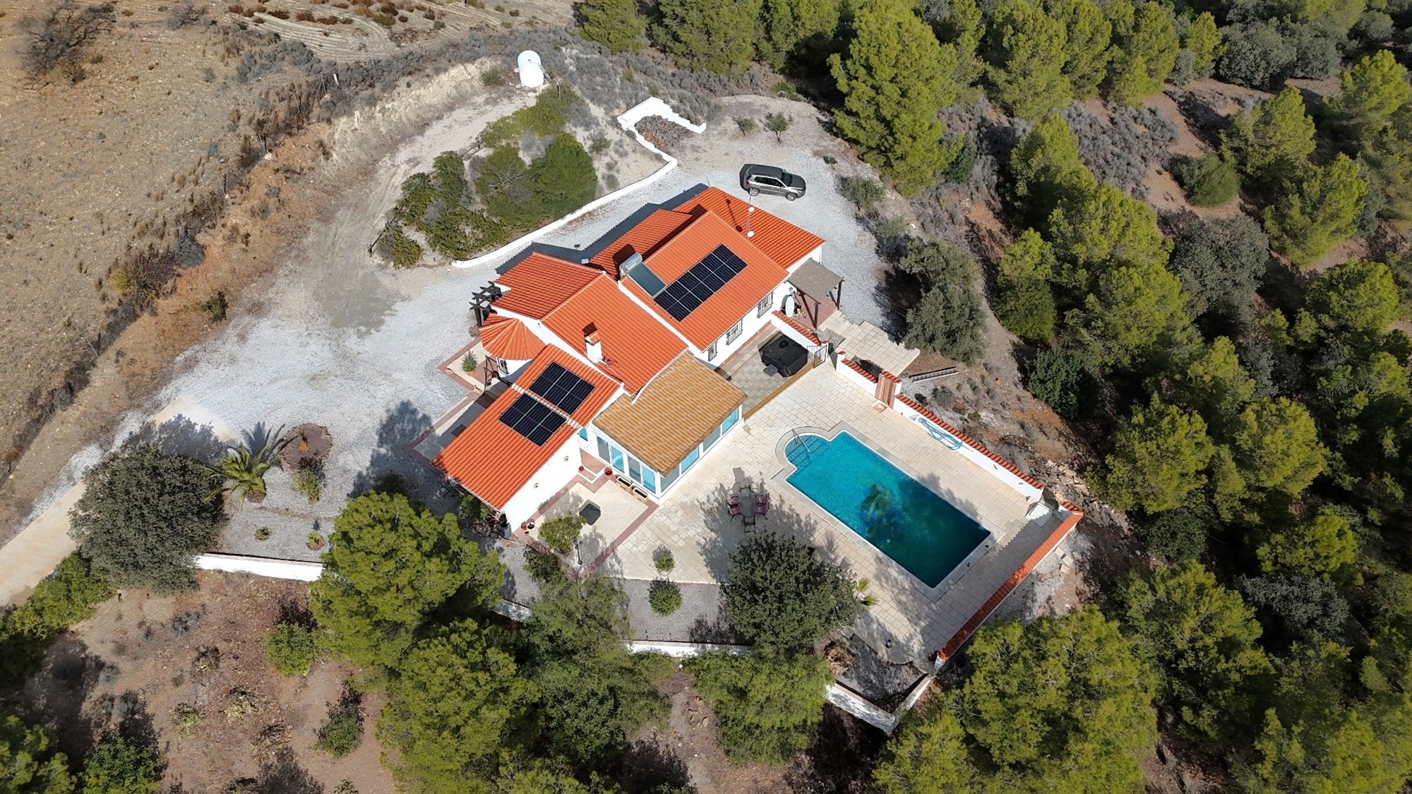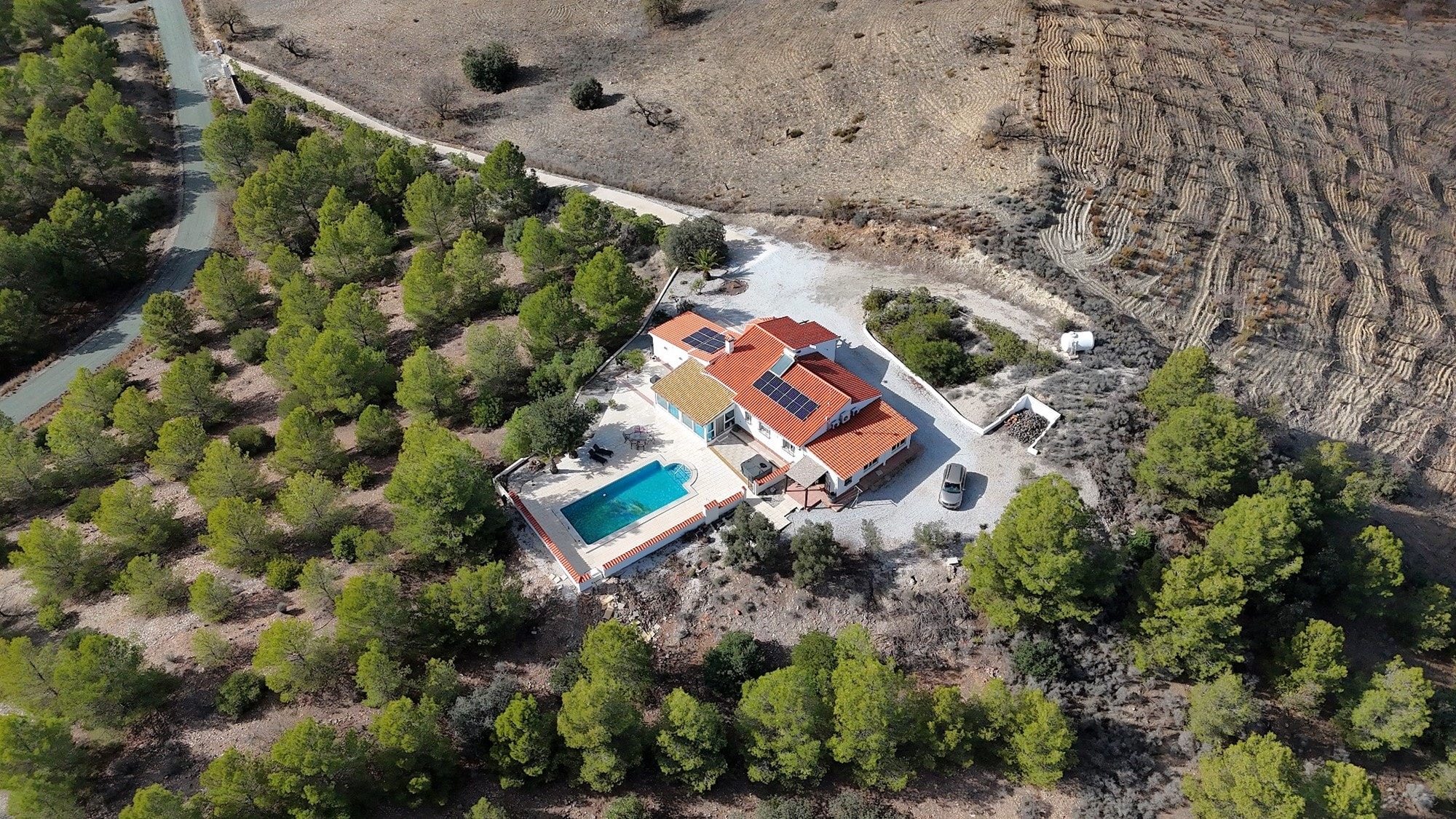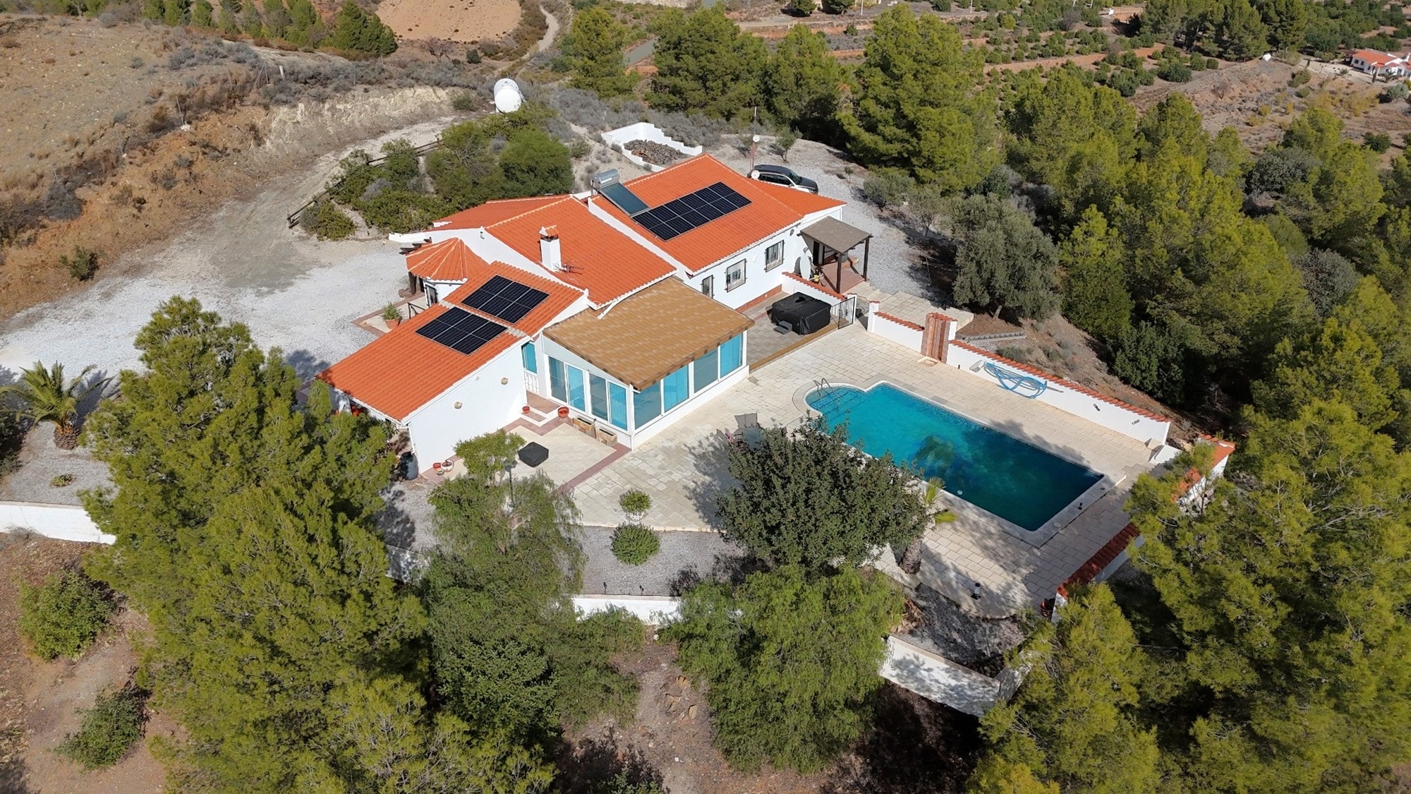 Well presented, uniquely designed Spanish 4 bedroom 2 bathroom Spanish country modern villa, with extras such as a 10m x 5m private swimming pool enclosed by a large courtyard, carport for 2 cars, large conservatory, landscaped mostly laid to gravel area around the house, gas central heating, set in a fantastic location with stunning views to the beautiful surrounding scenery. The property is enclosed by 20481 sq. metres of land fully fenced and gated. Excellent access being all tarmac and located just 1 minute’ drive to a service station with bar-restaurant-local shop, 3 minutes to the A92N Murcia-Granada motorway, 10 minutes’ drive from the market towns of Puerto Lumbreras (Murcia) and Velez-Rubio (Almeria) with plenty of amenities for day to day living, 20 minutes’ from the historic city of Lorca with its outdoor shopping centre and 45 minutes’ from the coastal resorts of Aguilas and San Juan de Los Terreros. The property enjoys absolute full privacy.