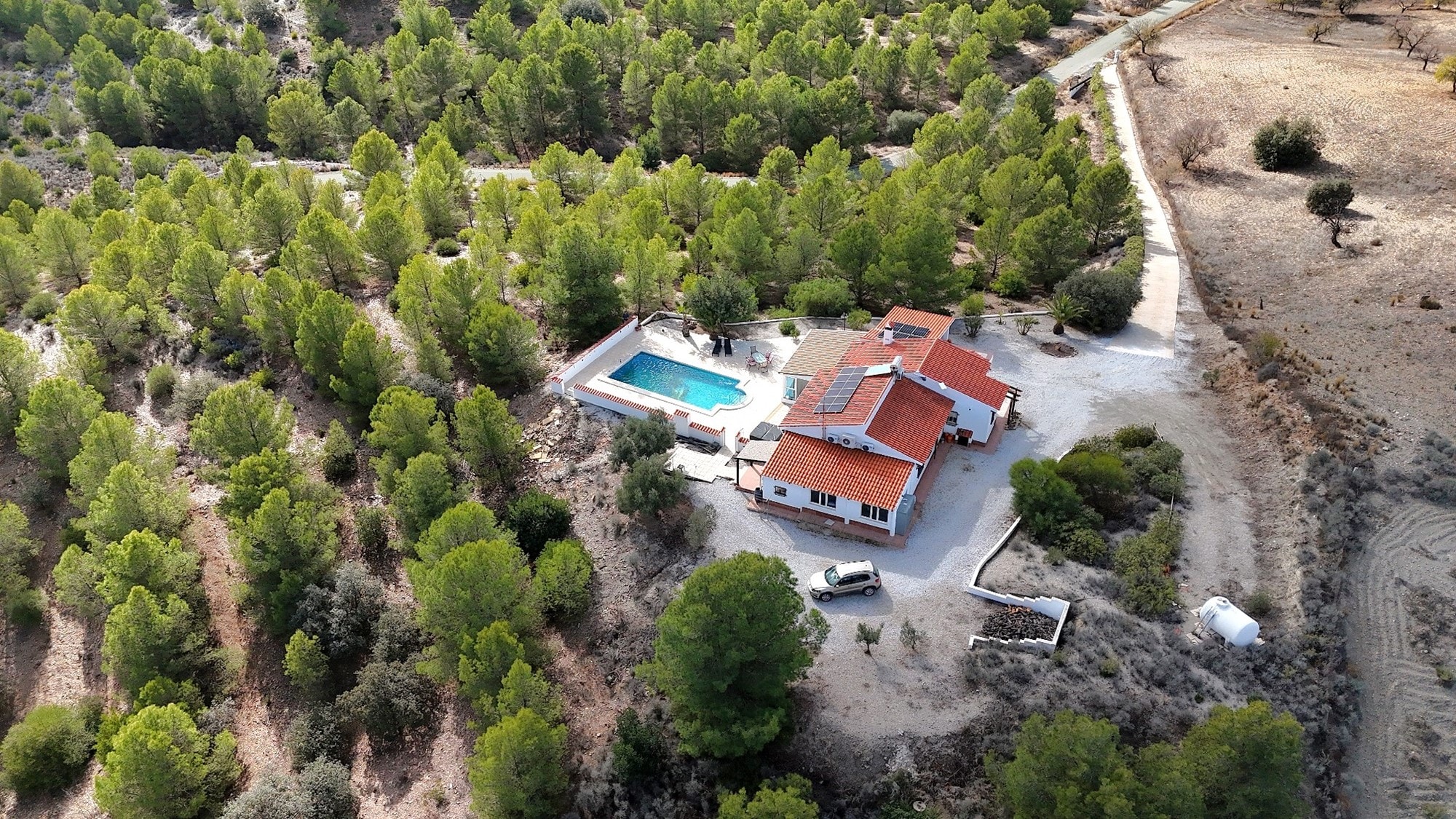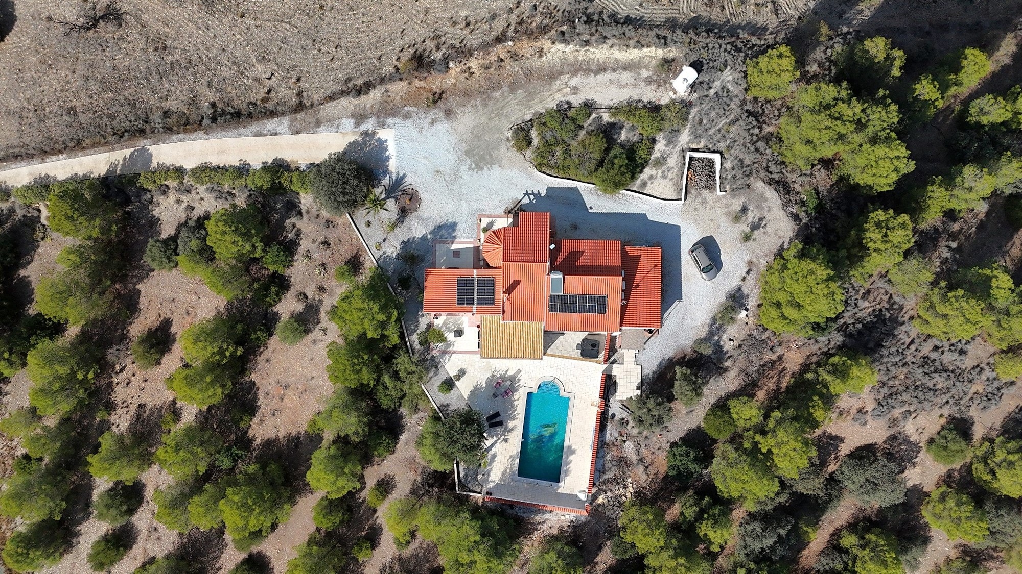 Excellent access off a tarmac road leading to large double iron gates and a private, paved driveway up to the house and to the car port. Large parking gravelled area to the rear of the property.