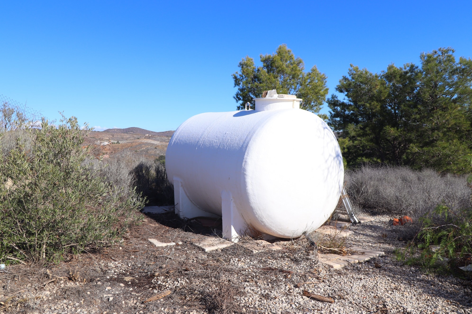 Water is via water deposit of 8000 litres which if filled up with a lorry tank. It last around 1 month for 2 people.