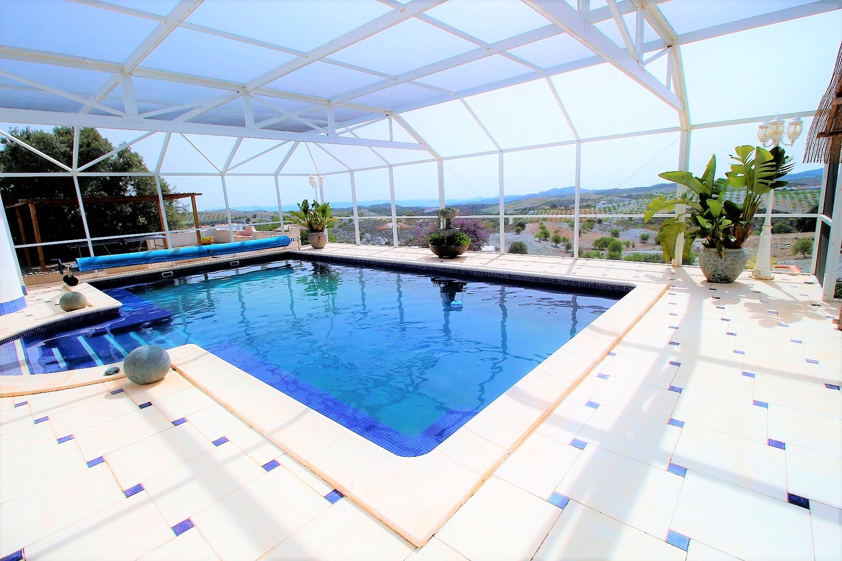 To the front of the property there is a large covered porch and a huge terrace area which includes an 10m x 5m swimming pool, shower, 6 seater jacuzzi and seating area totally covered by a Florida style enclosure (in need of repair) giving you stunning country views and allowing you to enjoy more of the outdoor lifestyle.